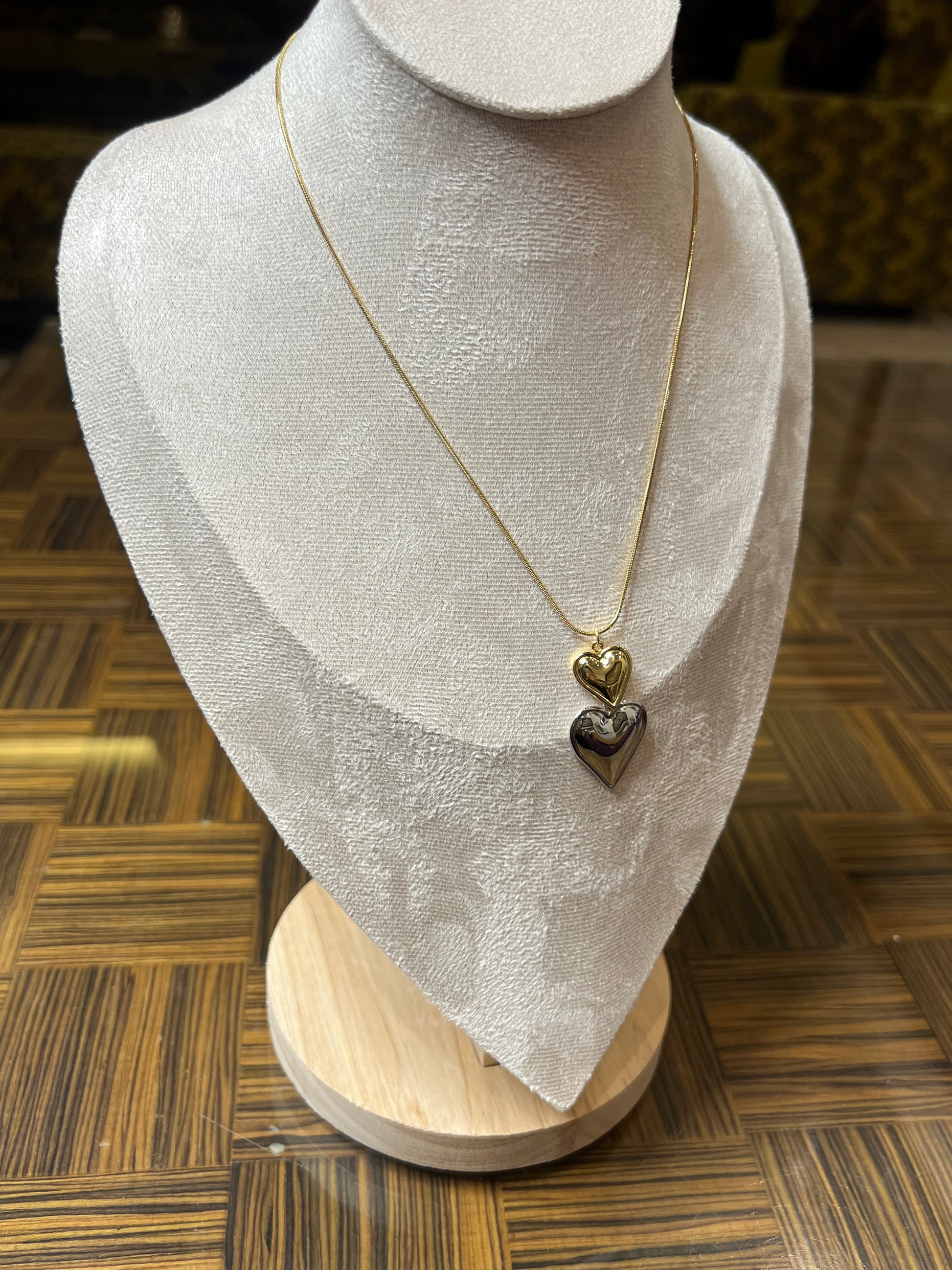This double heart necklace features a golden heart paired with a silver heart, creating a beautiful and cute design. The necklace is anti-tarnish and can be worn regularly without losing its shine. Perfect for any occasion.