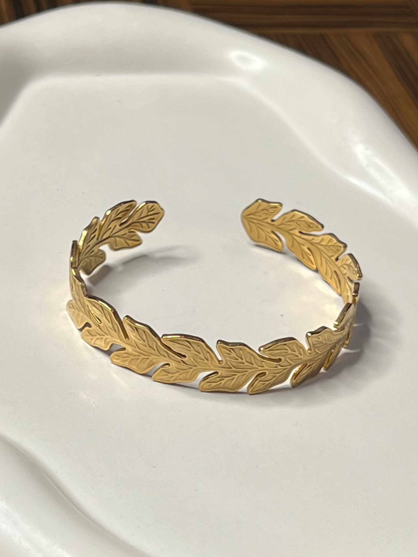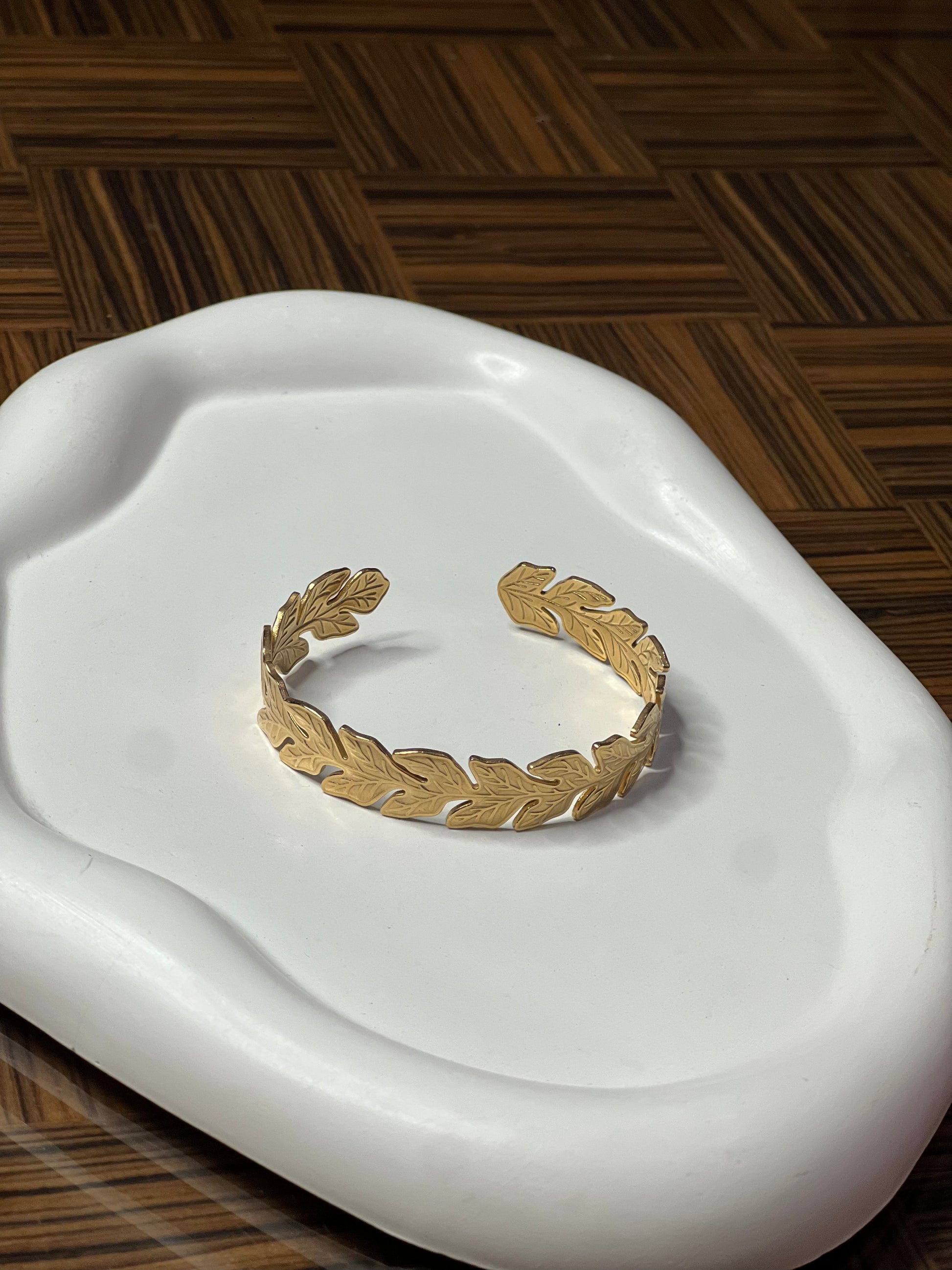 Crafted from stunning gold, the Enchanted Leaf cuff is the perfect nature-inspired accessory to elevate any outfit. Its delicate leaf design exudes elegance and charm, making it a must-have for any fashion-forward individual. Add a touch of nature to your style and make a statement with this beautiful cuff.