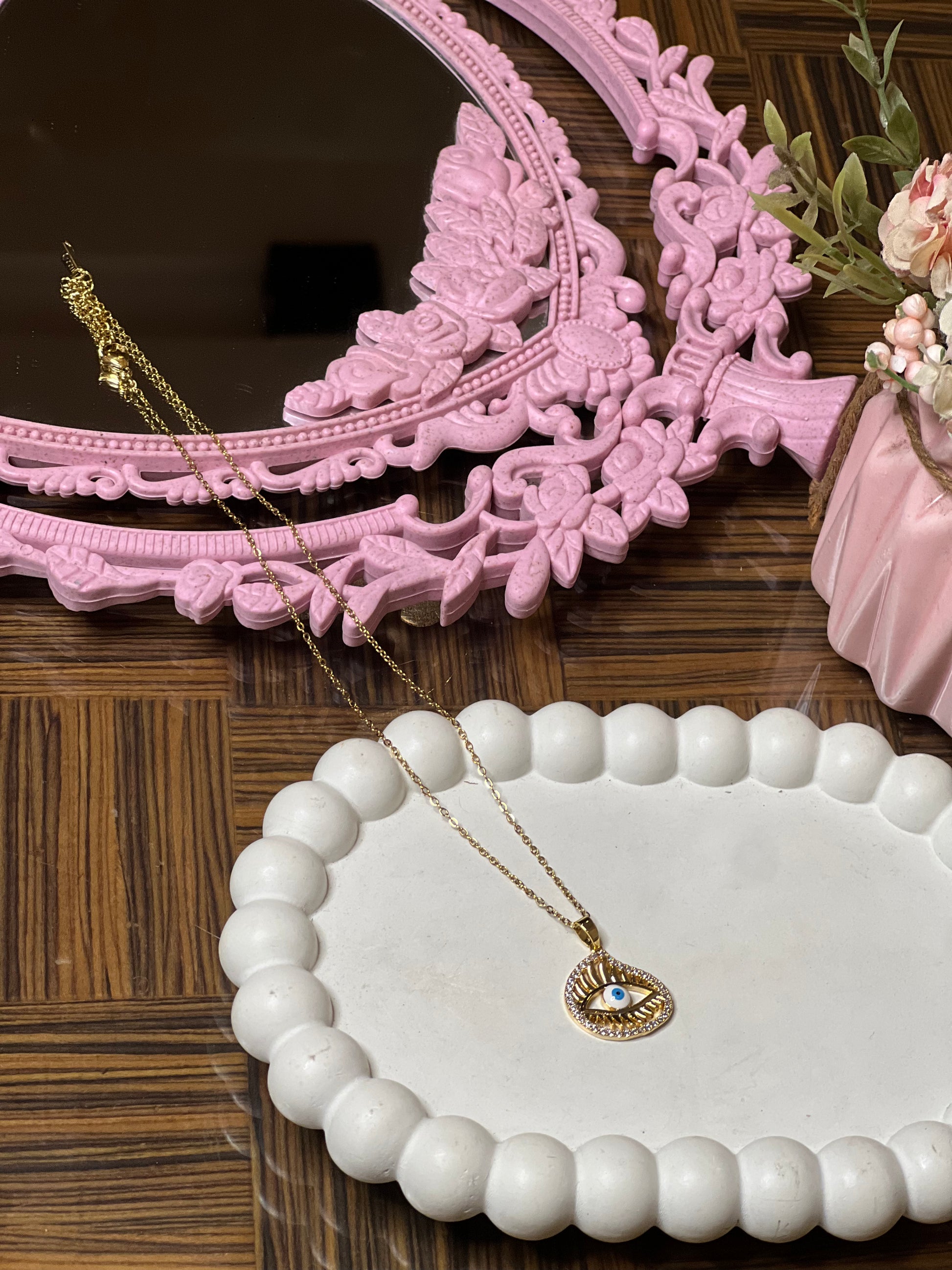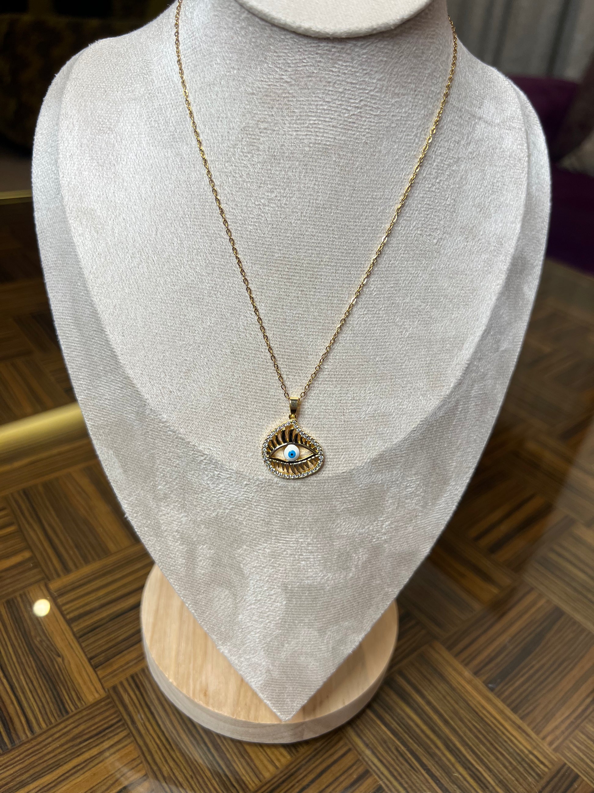 Experience divine protection in style with our Evil Eye Glamour Necklace. A statement piece that combines the traditional evil eye in a bold, blue center with a touch of glamour and class. Trust in its powerful symbolism and elevate your fashion game.